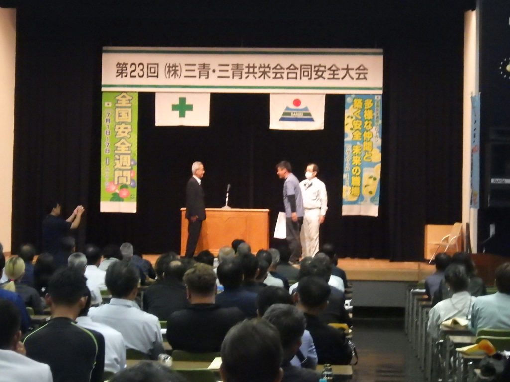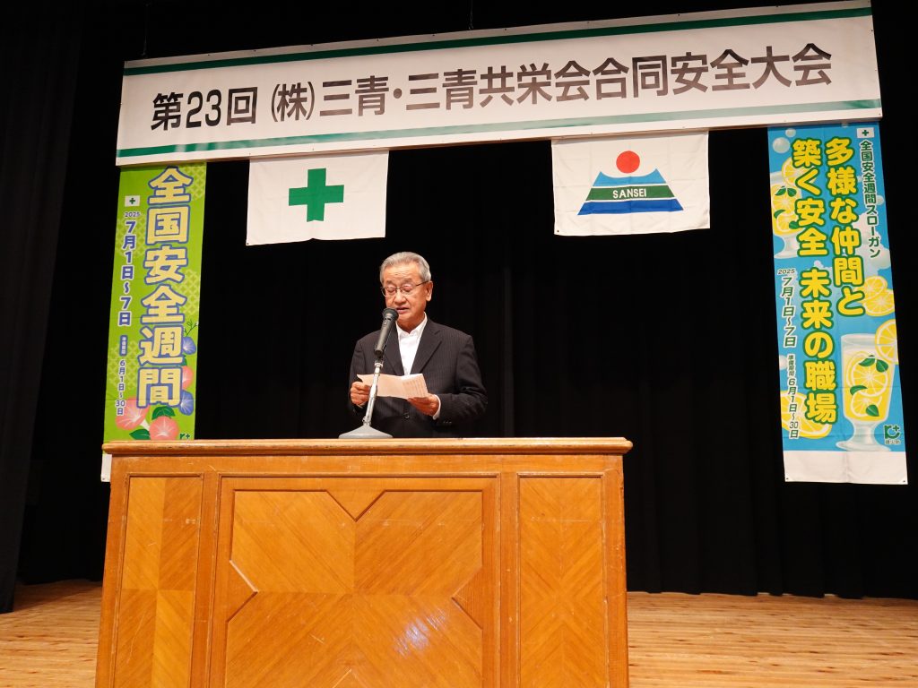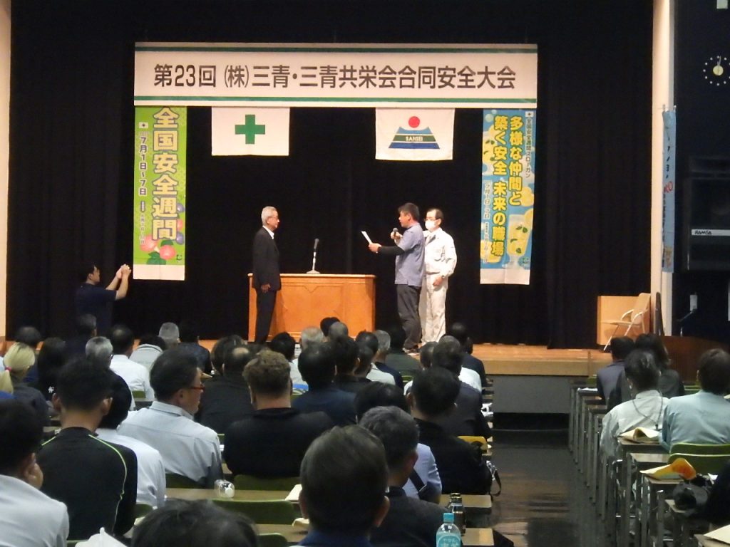 令和7年7月 島原文化会館にて、第23回(株)三青・三青共栄会合同安全大会が開催され同社及び協力会社から約160人が集まり安全意識の高揚と労働災害ゼロを誓いました。弊社代表取締役、江川睦美の挨拶の中で 常日頃からの安全対策への協力に謝意が示され、続けて全国安全週間スローガンを提唱し「この機会に安全意識を高めて労働災害・事故防止に取り組んでいただきたい。ご安全に!」と呼び掛け、併せてアクションZERO長崎ゼロ災運動への協力を求めました。また、当日は献血活動も実施され参加者の方々に積極的に参加して いただきました。三青共栄会の松田年市会長((有)松田組)は、毎年の協力に感謝を申し上げますと述べたうえで、熱中症予防・対策への取り組みを訴えました。安全講話には、島原労働基準監督署・安衛課の甲斐海慧労働基準監督官が登壇。労働災害発生状況と法改正についてと題し、労働災害発生状況を講じた上で 熱中症予防・ストレスチェックの法改正、長崎県島原警察署交通課の前田幸一郎巡査部長が交通安全の意識向上についてのDVDを上映しながら、日常生活での事故防止について解説していただきました。最後は、三青共栄会を代表して(株)松本建材の松本浩幸代表取締役が安全宣言。江川社長に対し、『多様な仲間と 築く安全 未来の職場』のスローガンのもと一人一人が安全な作業を心がけ安全を最優先し、意識の高揚を図り労働災害を未然に防ぎ絶対に起こさないという決意のもと、尚一層努力すると誓いました。